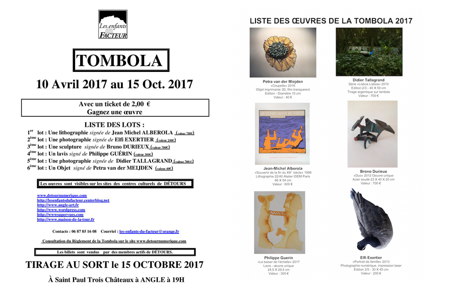 Les tickets de la tombola 2017 sont en vente à l'espace d'art François-Auguste Ducros de Grignan (Maison de pays, place du jeu de ballon) du mercredi au samedi de 13h à 18h et le dimanche de 13h à 17h.